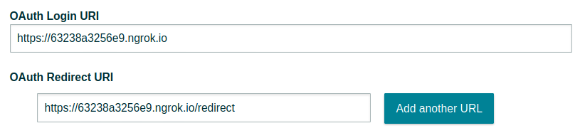 Open a new terminal and run ngrok http 4000. Then, put https://<YOUR NGROK URL> in the OAuth Login URI field for your app, and https://<YOUR NGROK URL>/redirect in the OAuth Redirect URI field. For me, that looked like this (your ngrok URL will be different):